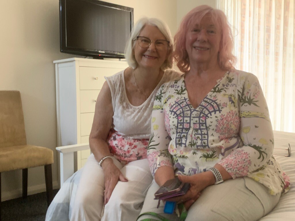 She was pleased to see us. This picture was taken in the guest room we had rented overnight from the Retirement Village Bonnie now lives in. It was a regular size double bed and too small for me.