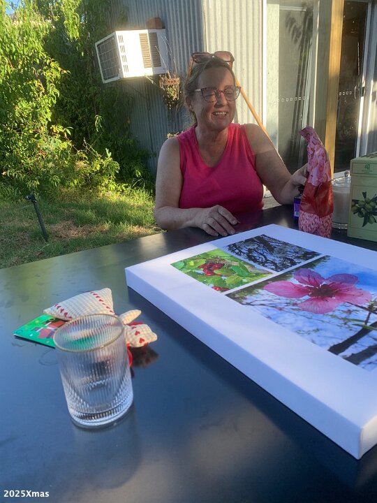We exchange gifts. Jenni presented Jacqui with a photo montage of pictures that she had previously taken at Jacqui's place.